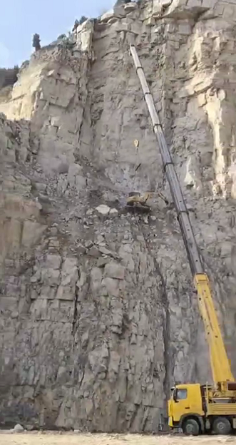 大家都知道,挖掘機作業的環境是十分多變的,所以也是一件具有危險性的事,因為家庭的壓力以及高薪的誘惑,許多人也會因此選擇高難度的作業環境。可以看到,地面上的吊車將一輛挖掘機吊起在半空中進行排險作業,而挖掘機的行走部