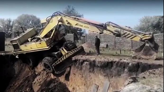 上坡猛抬大臂?挖掘機這下摔得夠慘!